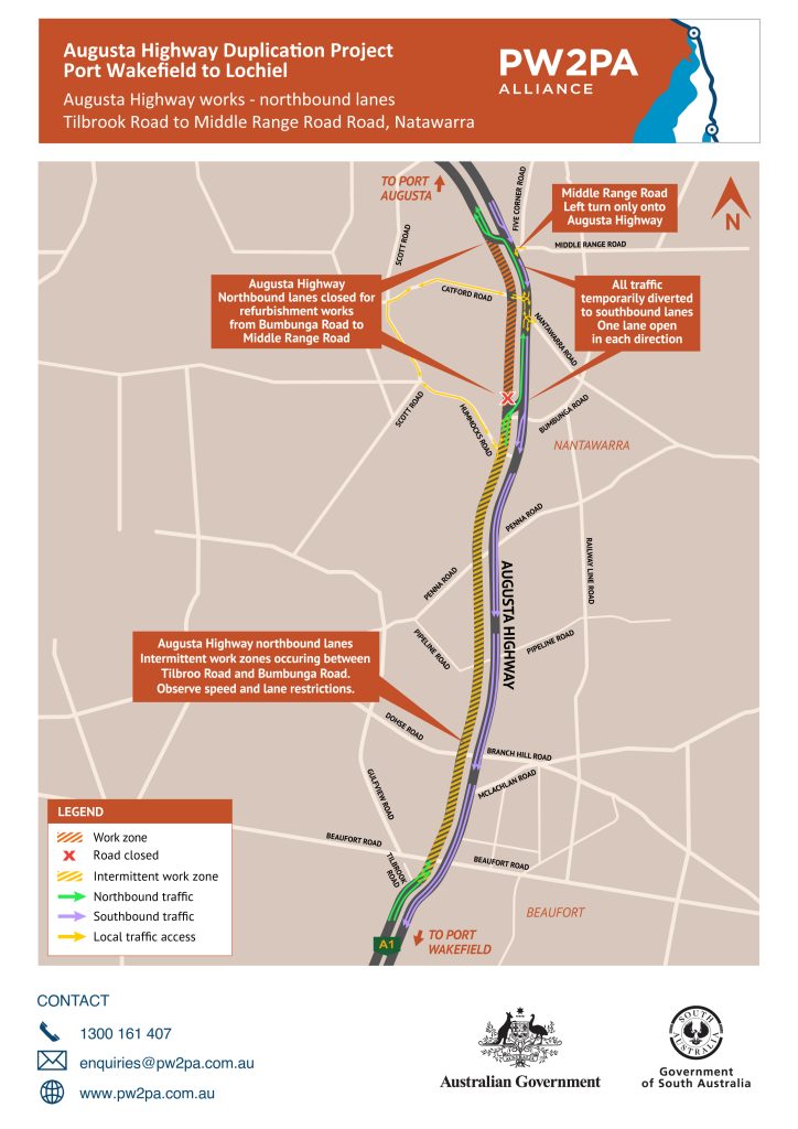 - Between Bumbunga Road and Beaufort Road – lane closures and reduced speed limits will be in place for the duration of the works. One lane will remain open at all times.