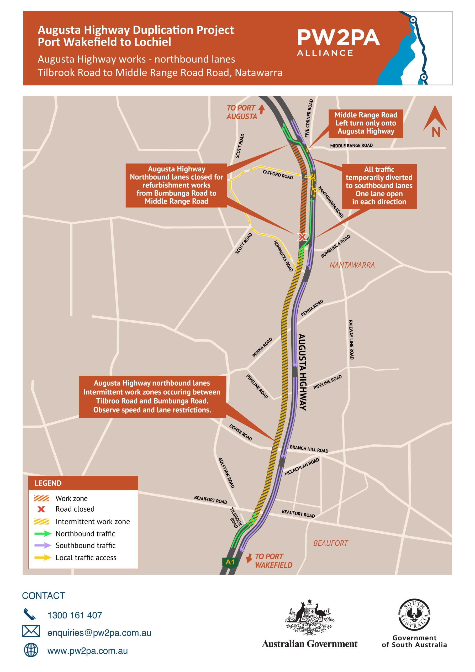 Works will commence Wednesday 29 October to construct lane cross overs at Middle Range Road and Bumbunga Road to enable works to be carried out (see map below for details).
